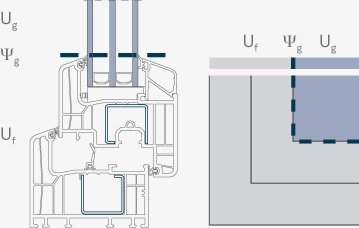 Az U w hőátadási együttható az egész ablakra vonatkozik. Ez az érték magában foglalja az U-értékeket az üvegezéshez és az U fi kerethez . Az Uw teljes értéket szintén befolyásolja a lineáris hőátadási tényező (g = üvegezés) és az ablak mérete.